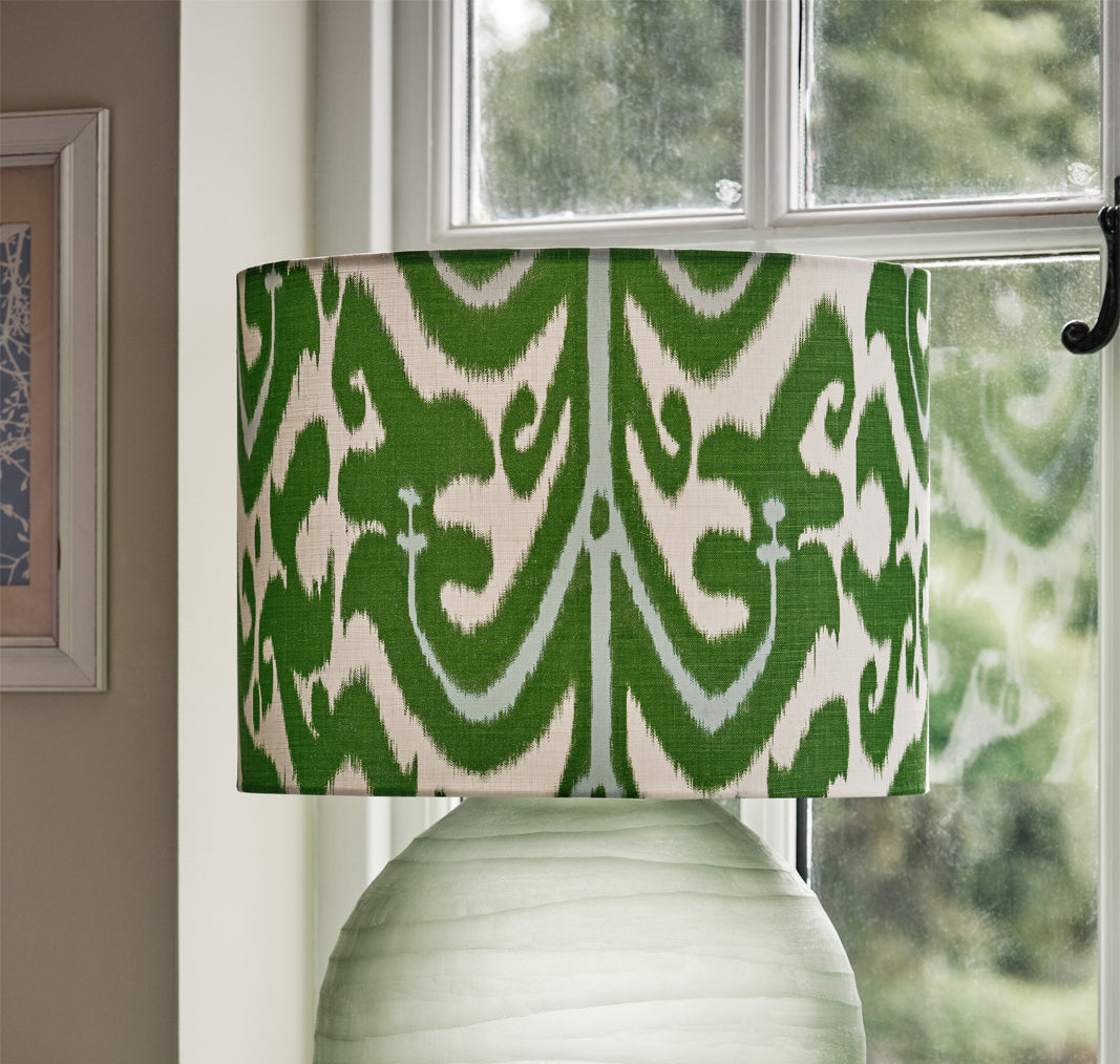 The perfect Ikat lampshade, Ikat Luxe in aqua blue and green, fuses classic chintz with a bohemian artisanal vibe. It is printed on 100% linen, giving it a luxurious and rich look. This is an eye-catching piece which will add style and sophistication to any space.