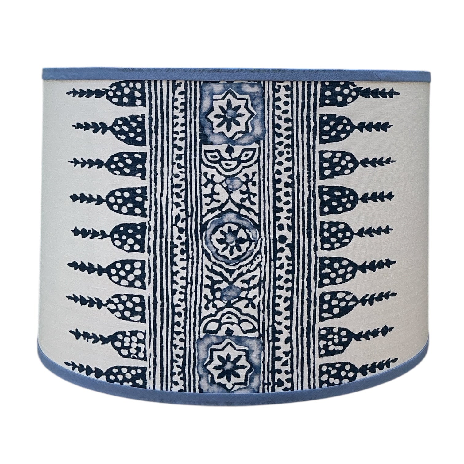 Archipelago Blue is a stunning lampshade displaying bold vertical stripes with an intricate pattern of ornate floral motifs inspired by traditional Javanese warriors. The combination of blue and cornflower blue trim will bring a timeless sophistication to any space.