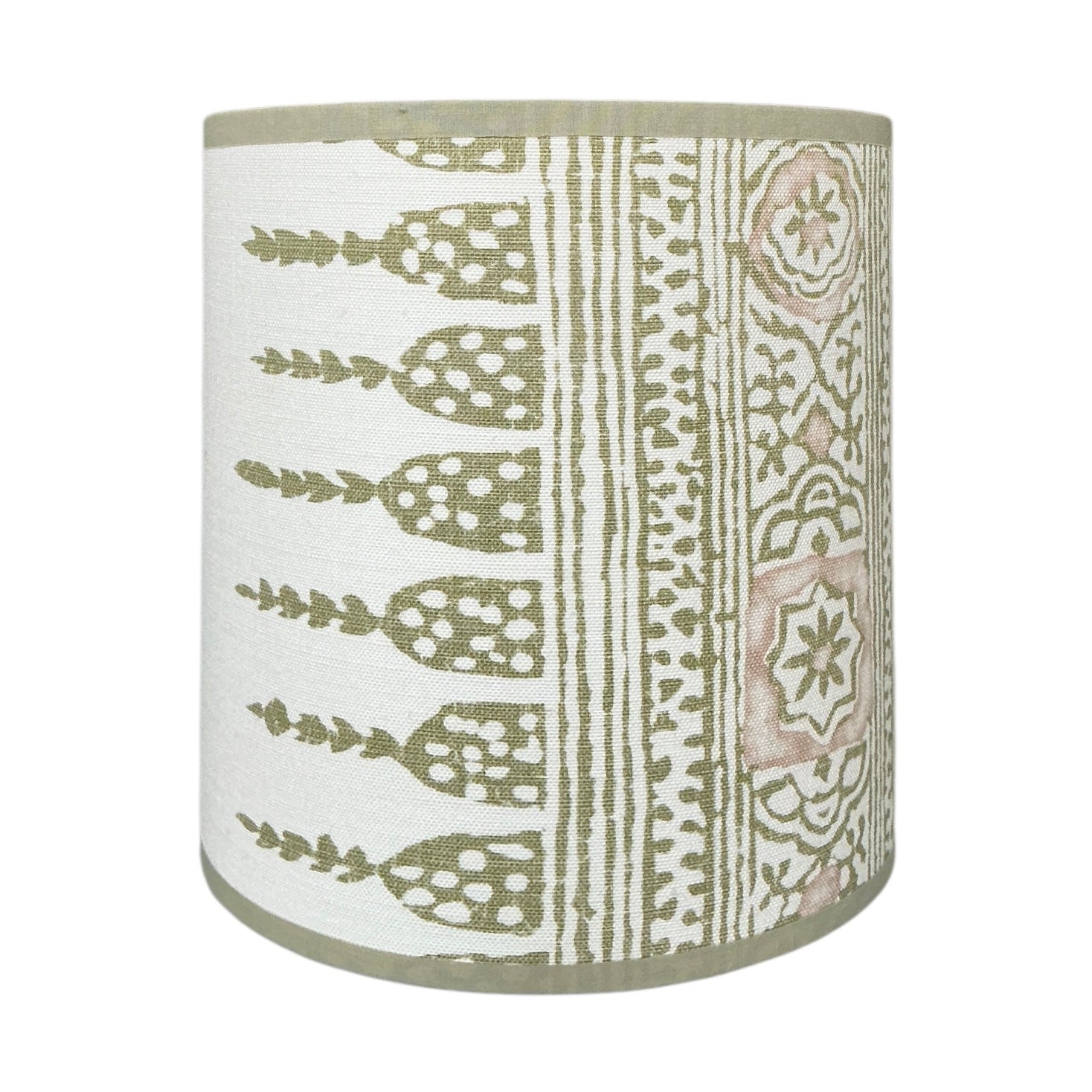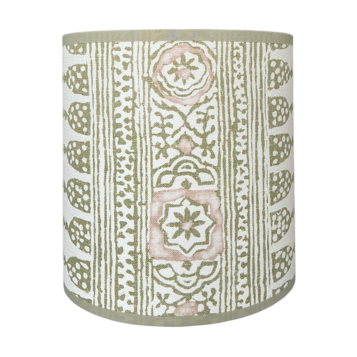 Archipelago Sage is a stunning lampshade displaying bold vertical stripes with an intricate pattern of ornate floral motifs inspired by traditional Javanese warriors. The combination of Sage green and blush pink, will bring a timeless sophistication to any space.