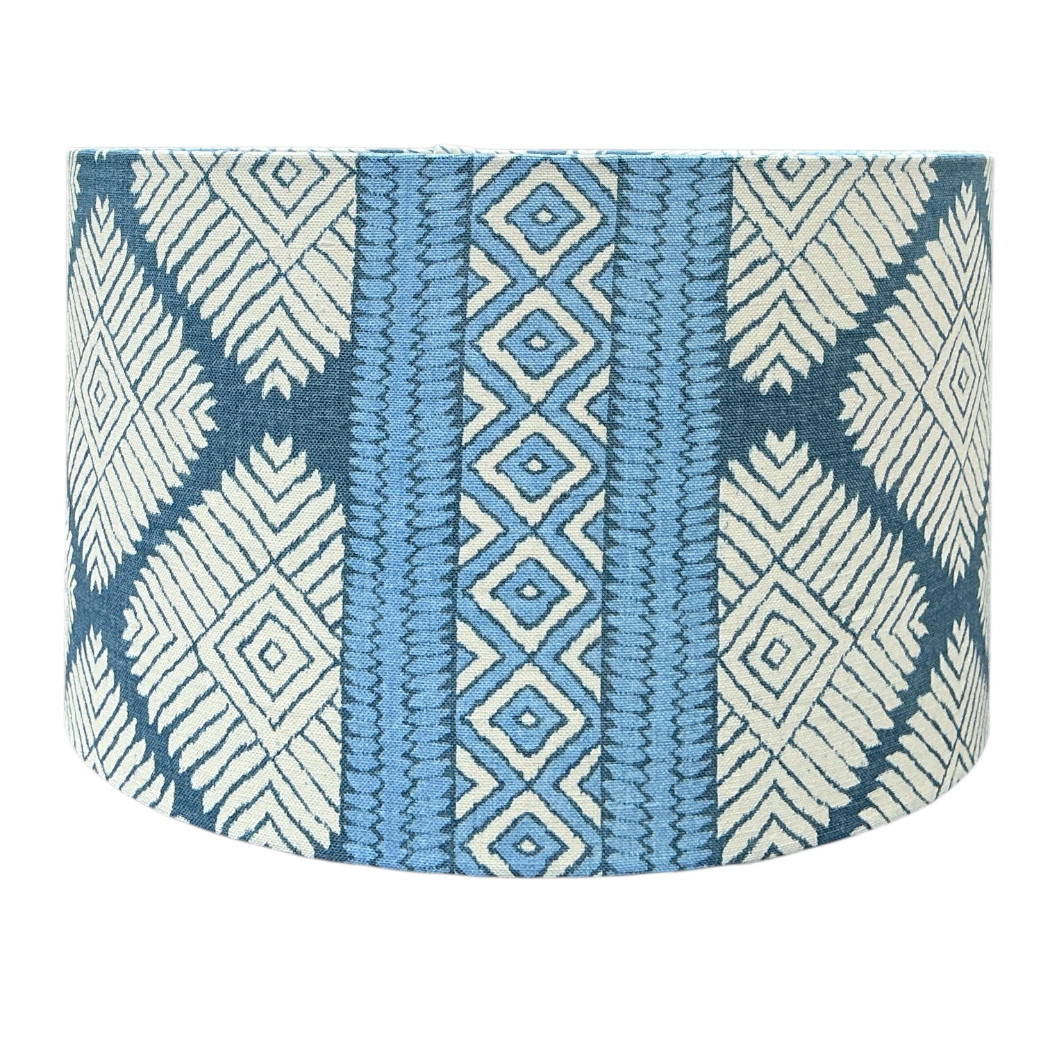 This fabric offers timeless elegance with a bold, tribal style, featuring a striking diamond pattern interwoven with rich navy and contrasting stripes. It adds a sophisticated, tribal inspired charm to any space.